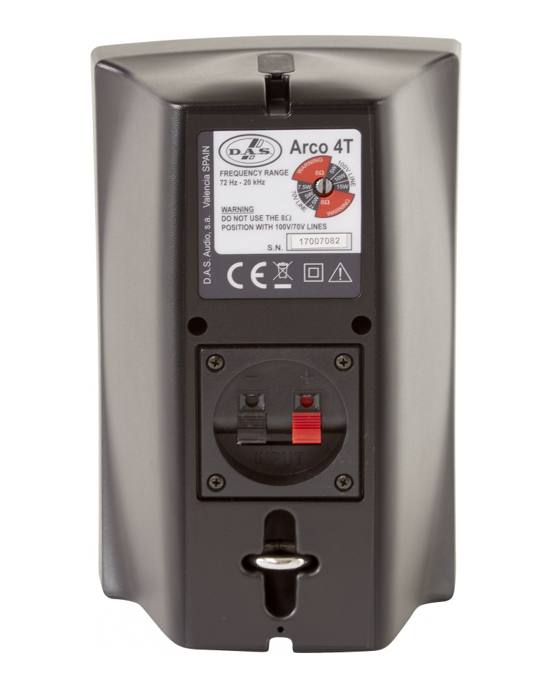 اسپیکر پسیو DAS AUDIO ARCO 4T در دو حالت اهمی و ولتی دارای توان مختلفی است. امپدانس این بلندگو 8 اهم می باشد. برای راه اندازی در حالت اهمی نیاز به 50 وات توان و 200 وات برای راه اندازی در حالت ماکزیمم لازم است. در حالت ولتی توان بلندگو برروی 100 ولت برابر 15W ، 10W، 5W ولت برابر 7.5W ، 5W ، 2.5W می باشد که توسط یک کلید چرخشی در پشت بلندگو قابل تنظیم است. سوکت اتصال سیم به بلندگو به صورت ترمینالی( فشاری) می باشد که با رنگ های مشکی و قرمز تفکیک شده است.