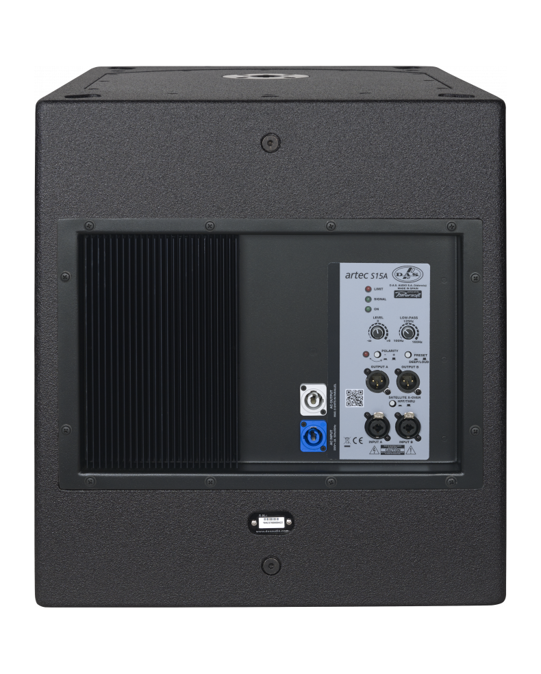 ساب ووفر DAS AUDIO ARTEC-S15A اکتیو بوده و دارای امپلی فایری قدرتمند با کلاس توپولوژی D می باشد که به پاور سوئیچینگ معروف بوده و به دلیل اتصال راحت و راه اندازی آسان به محبوبیت بالایی دست پیدا کرده است. دو ورودی با کانکتورXLR قفل دار اطمینان بیشتر در اتصال را به همراه دارد. دو عدد خروجی سیگنال برای لینک کردن و لوپ شدن بین ساب و ستلایت می باشد. هر خط خروجی سیگنال دارای سر ولوم چرخشی مجزا برای تنظیم مقدار صدای خروجی می باشد. از جمله قابلیت های اصلی این ساب ووفر استفاده از پاور کن می باشد که با لینک کردن سایر بلندگو ها می توان برق رسانی به چندین بلندگو را انجام داد و به راحتی به سایر دستگاه ها با لینک پاورکن یا لینک برق متصل نمود. امپلی فایر ساب ووفر S15A دارای سه چراغ نشانگر برای نشان دادن : خاموش و روشن دستگاه ، میزان سیگنال و مقدار لیمیت دستگاه است.