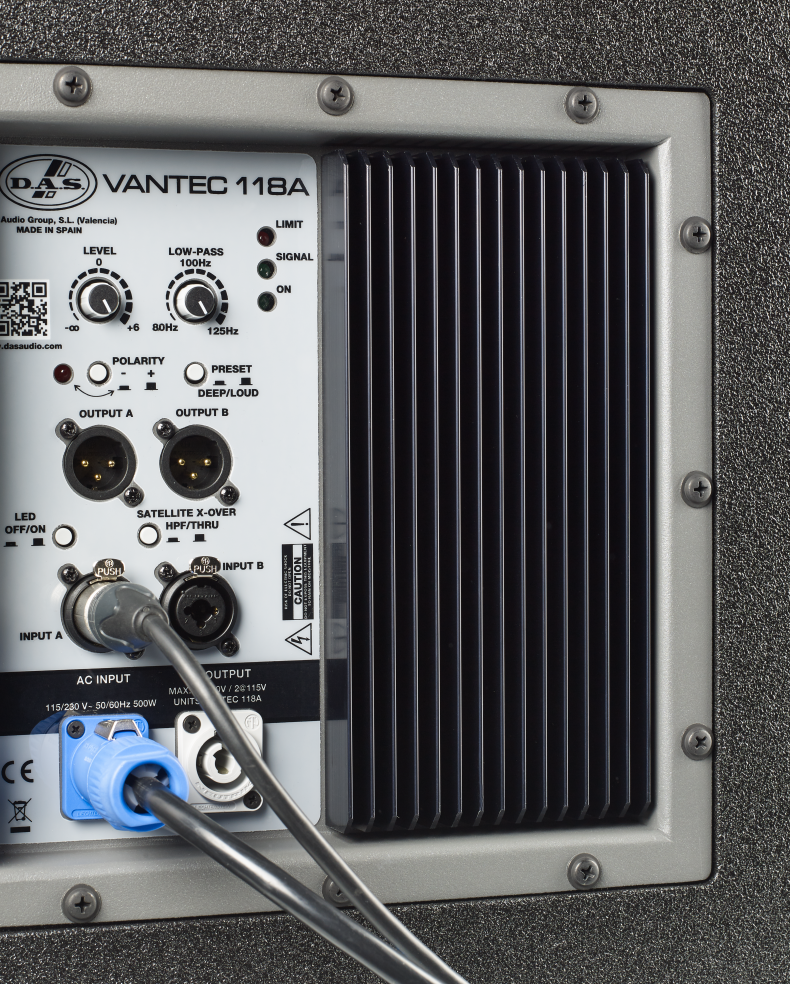 اسپیکر اکتیو لاین اری DAS AUDIO SUB WOOFER VANTEC 118A برای راه اندازی تنها به برق شهری و سیگنال نیاز دارد. امپلی فایر قدرتمند داخل این لاین اری طراحی شده که دارای دو ورودی با کانکتور XLR کمبو قفل دار و دو خروجی سیگنال جهت لوپ کردن و لینک بین ساب و بلندگو ها می باشد. برای اتصال برق از پاوکون استفاده نمایید که قابلیت لینک برق بین بلندگو ها را نیز دارد. در هنگام اری کردن با این قابلیت به راحتی می توانید به سایر اسپیکر ها برق رسانی نمایی و دیگر احتیاج به استفاده دو شاخه های برق متعدد نخواهید داشت.