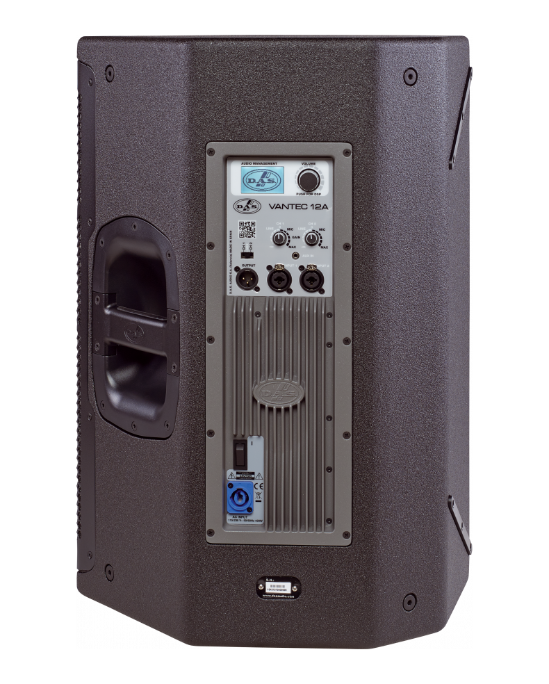 بلندگو اکتیو و مانیتور داس مدلD.A.S VANTEC 12 A اکتیو بوده و برای راه اندازی تنها با اتصال کابل پاورکون به برق شهری می توانید دستگاه را راه اندازی نمایید. این اسپیکر اکتیو دارای یک کلید خاموش و روشن می باشد. دو ورودی کمبو XLR و یک عدد خروجی سیگنال که هر دو ورودی دارای یک سر ولوم مجزا می باشد. این سر ولوم ها به صورت مجزا برای کنترل میزان سطح صدای خروجی مورد استفاده اند. برای سهولت در کار و دسترسی به منوی اصلی دستگاه یک نمایشگر رنگی گرافیکی در پشت دستگاه تعبیه شده است.کلید فشاری چرخشی روی این نمایشگر قابلیت کنترل EQ سه باند را داشته و توسط آن می توان به مدیریت بلندگو دسترسی پیدا کرد.