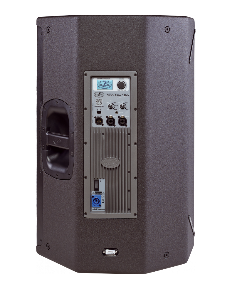 بلندگو DAS AUDIO VANTEC 15 A اکتیو بوده و در خود امپلی فایری قدرتمند از سری کلاسD دارد که برای راه اندازی فقط به برق شهری نیازمند می باشد و با سیگنال رسانی سیستم صوتی شما راه اندازی می شود. این امپلی فایر دارای دو ورودی مجزا برا لینک کردن و سیگنال رسانی می باشد. هر ورودی داری سر ولوم مجزا برای کنترل میزان سطح صدا می باشد ک می توان صدای خروجی و مقدار دسیبل را با آن تنظیم نمایید. یک کانکتور هدفونی برای اتصال هدفون به این اسپیکر اکتیو طراحی شده است. جهت راه اندازی توسط یک کابل پاورکن و دکمه خاموش و روشن می توان دستگاه را راه اندازی نمود. یک عدد نمایشگر رنگی در پشت بلندگو برای استفاده راحت تر از منو پیشرفته اسپیکر قرار داده شده است.