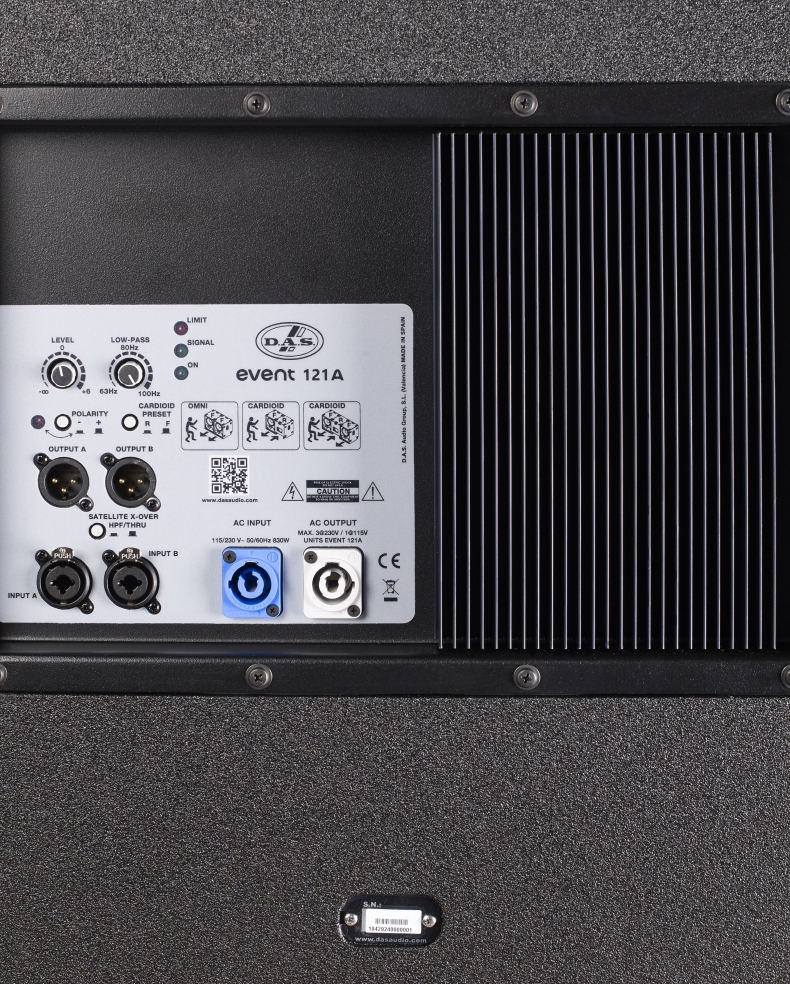 بلندگو ساب ووفر اکتیو EVENT-121A دارای یک آمپلی فایر بسیار قدرتمند است که دارای دو ورودی و دو خروجی با کانکتور های XLR کومبو قفل دار در ورودی و XLR نر نصبی در خروجی است که یک سر ولوم چرخشی برای کنترل میزان سطح صدای خروجی در آن تعبیه شده و یکی از ویژگی های خاص این محصول دارا بودن از سر ولوم چرخشی میزان فرکانس صدای خروجی است که به عنوان DSP دستی می توان از آن استفاده نمود. علاوه بر آن برای راه اندازی نیاز به برق شهری دارد و این منبع توسط کابل پاورکون تغذیه می شود و می توانید با لینک پاورکون تعبیه شده تعداد بالایی از سیستم ها را تنها با یک کابل اصلی برق رسانی نمایید. همچنین دارای یک برچسب QR CODE است که با اسکن آن می توانید به سایت کمپانی متصل شده و از صحت اصل بودن کالا مطلع شوید. ناگفته نماند که کلاس این آمپلی فایرD می باشد.