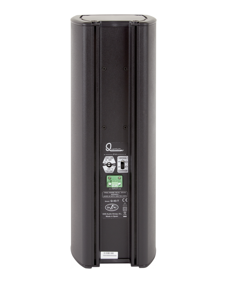 بدنه آلومینیوم اسپیکر DAS AUDIO QUANTUM Q 43 T باعث وزن سبک این سیستم را به همراه دارد. بهره مندی از IP 54 در بدنه این بلندگو پسیو مقاومت کابینت را افزایش داده و امکان استفاده در محیط های باز را فراهم میکند. توری مشبک فلزی جلوی دستگاه برای جلوگیری از پخش گرد و غبار و بدنه از سیستم در برابر رطوبت و قطرات باران ایمن نگه میدارد. لازم به ذکر است این بلندگو ضد آب نمی باشد. براکت های نصبی و اکسسوری های فابریک متنوع در این محصول با کارایی بالا وجود دارد. بلندگو پسیو دکوراتیوD.A.S QUANTUM Q 43 T اسپیکر فول رنج با صدای میانی بوده که به صورت ONE WAYاستفاده میشود. تعداد 4 عدد ووفر سه اینچی با مدل 3P16با پرتاب صدای مناسب در این اسپیکر در نظر گرفته شده است. زاویه پرتاب صدا در اسپیکرQUANTUM Q 43 T در حالت عمودی برابر120 درجه و در حالت افقی با بهره مندی سوئیچ تغییر میزان زاویه روی کراس اور، در دو حالت 45 درجه و 30 درجه است. با تعیین مقدار پرتاب صوتی در هر بلندگو میتوان جانمایی درستی در سالن مد نظر انجام داد تا صدایی یکسان و شفاف در سرتا سر سالن موجود باشد. میزان دامنه فرکانسی در بلندگو داس کوانتوم Q 43 Tاز150 هرتز تا20 کیلوهرتز متغییر می باشد. این مقدار بر اساس کراس اور استفاده شده در بلندگو تعیین می گردد.